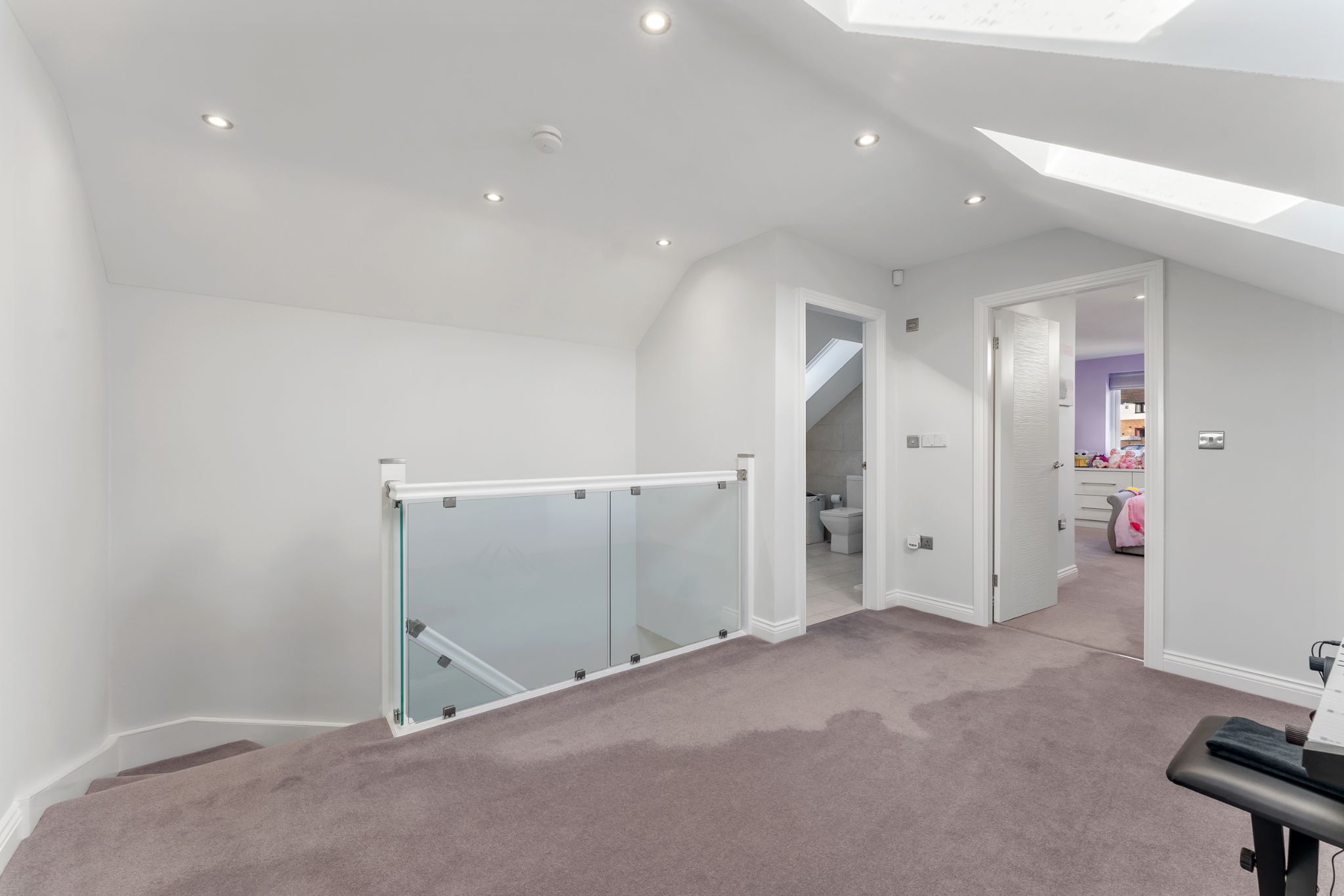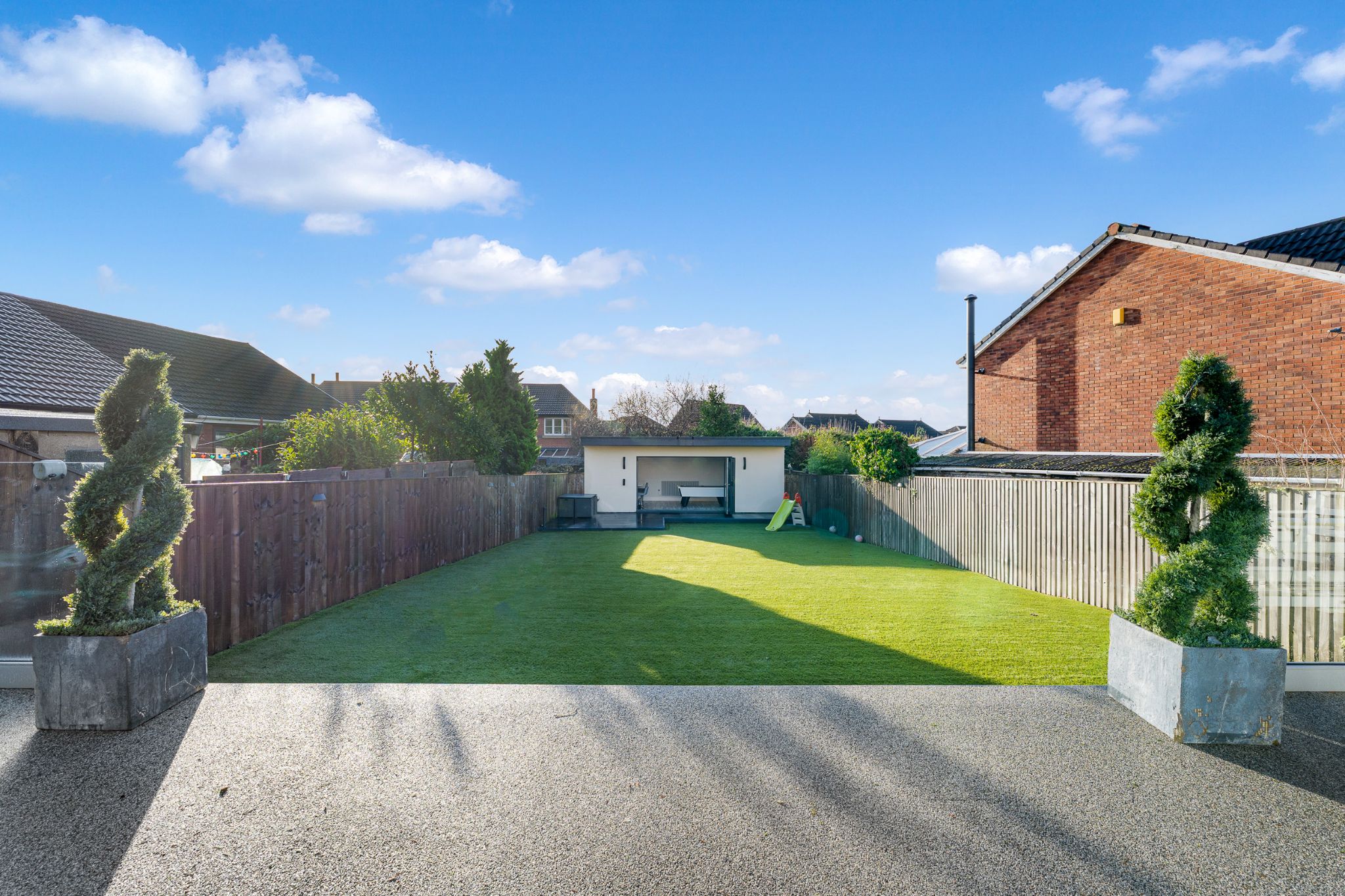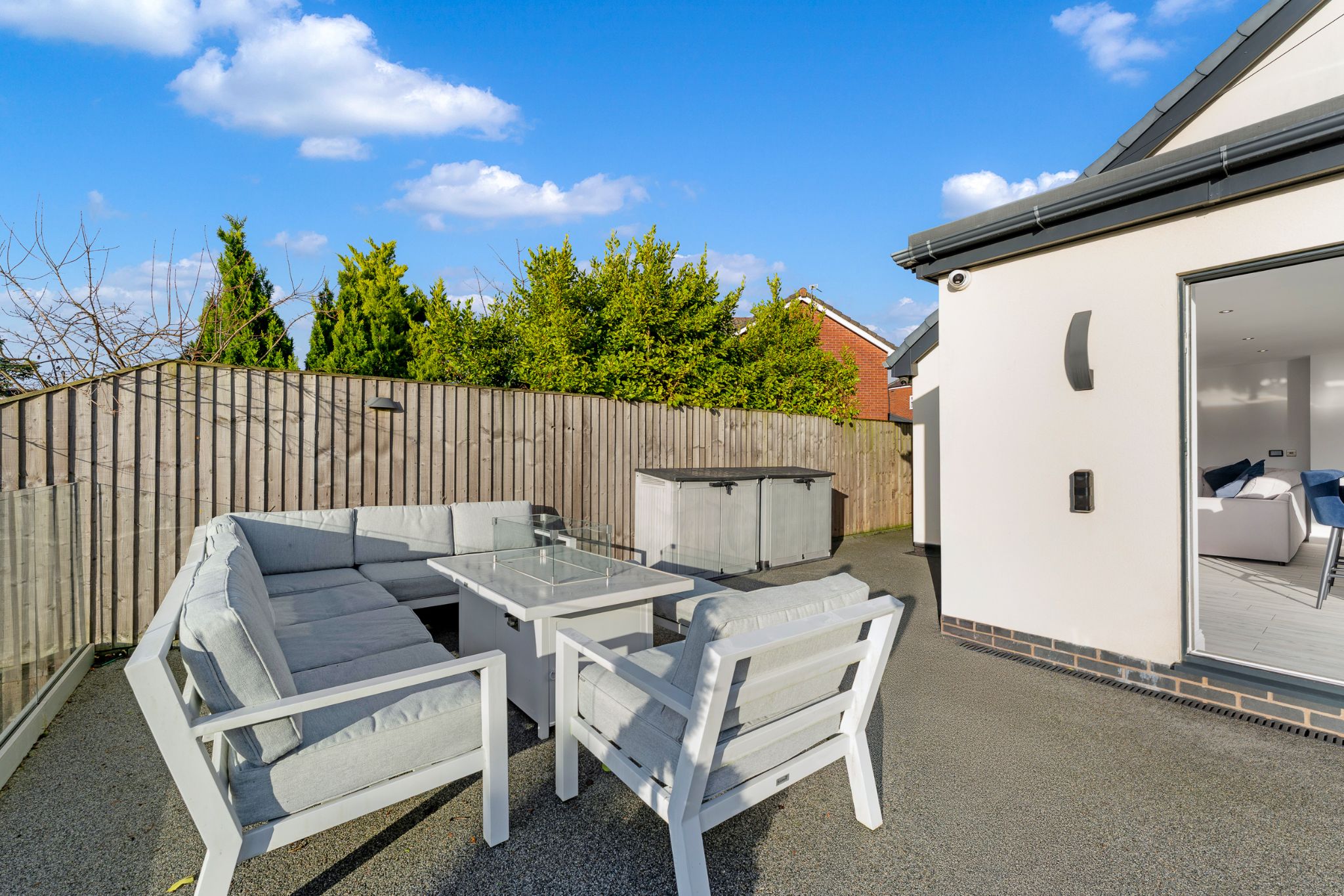 Externally, the home sits on a generous plot, complete with a professionally landscaped rear garden, a substantial grey resin patio area with a glazed balustrade and outside lighting, perfect for dining al-fresco through those warmer summer months. The adults can sit and relax on this patio and fire up the BBQ, whilst they sit and watch the kids play happily on the extensive astro-turfed lawns. A fabulous garden room provides flexible space for a number of uses and features power and light, bi-folding doors to open up onto the garden. A gated driveway offers secure off-road parking and leads to a detached garage. The property is complete with a secure alarm and camera system.