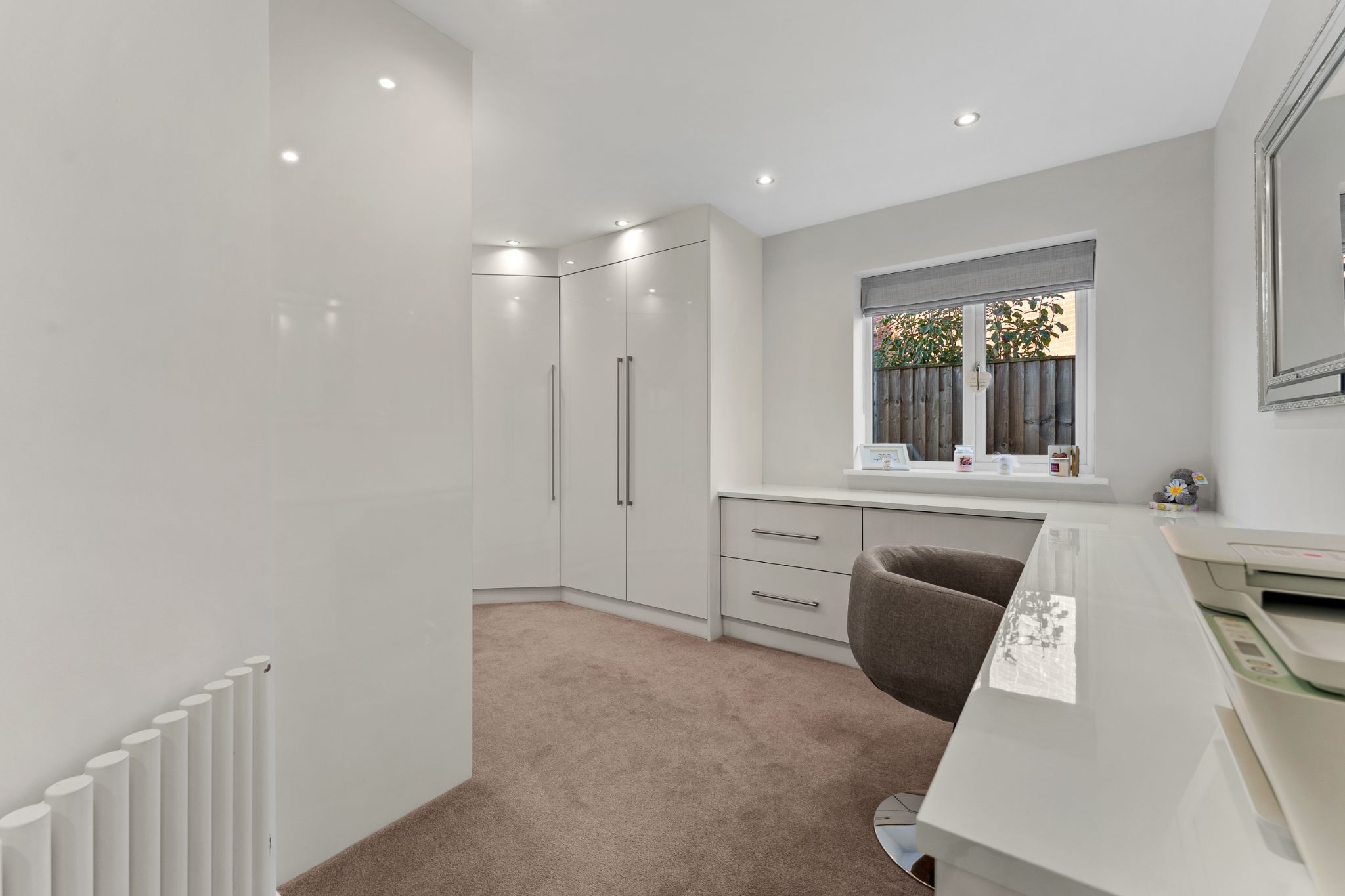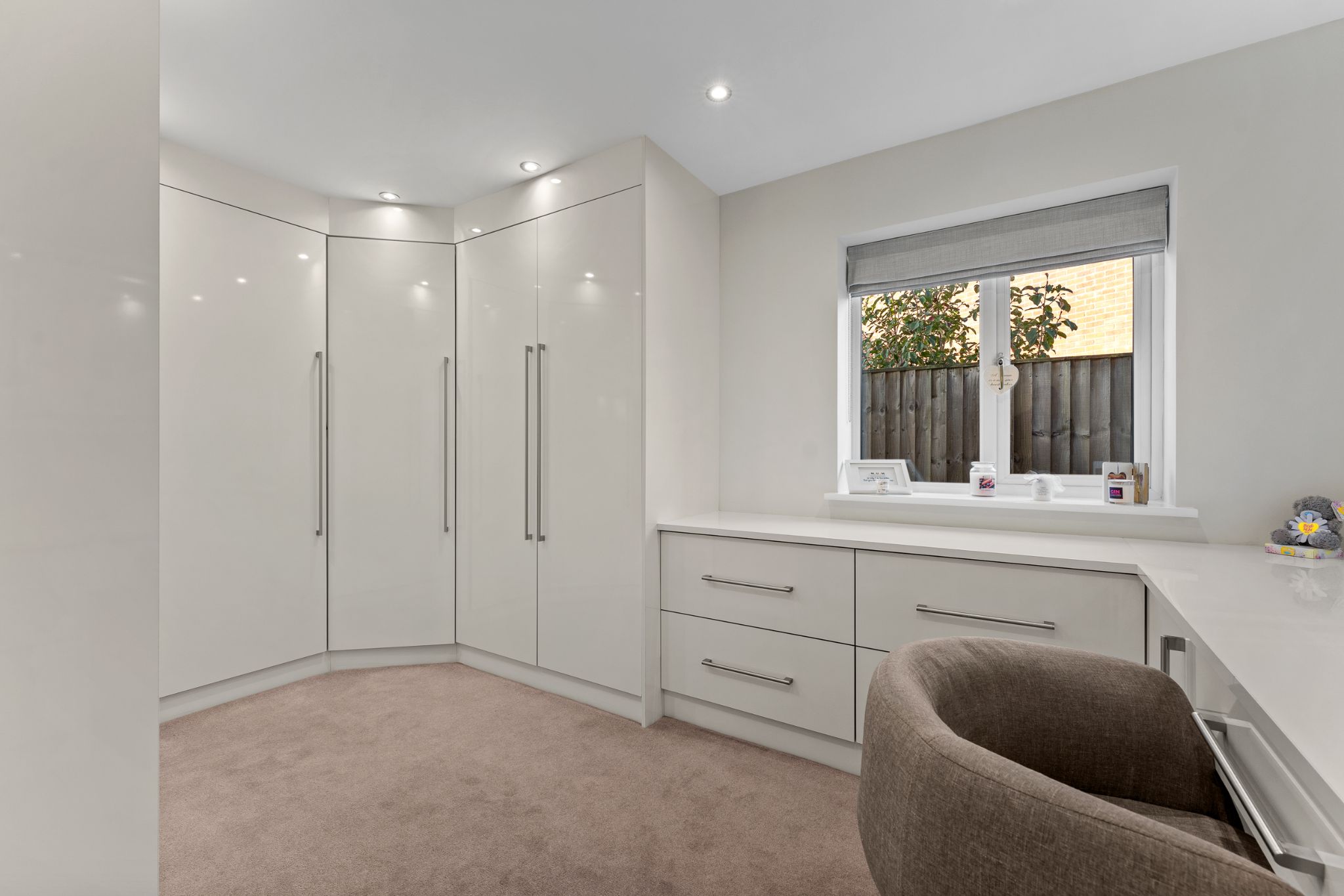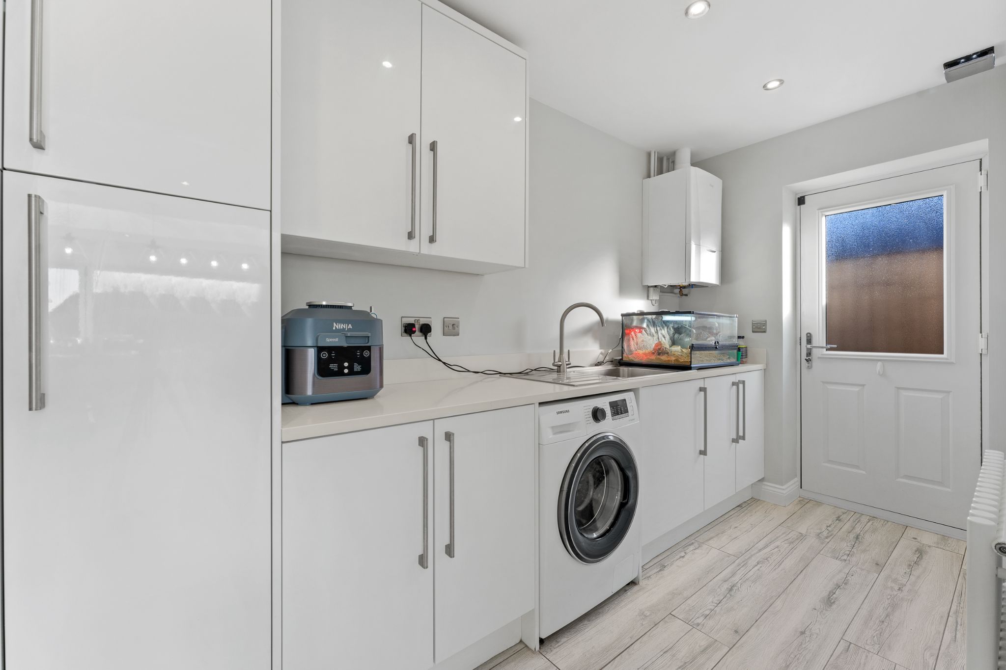 There is a separate utility room also with white gloss wall and base units, quartz worktops, a stainless steel sink, washing machine and a side door leading to the back garden. For added convenience, there is a well-appointed downstairs W.C., opposite this there is an inbuilt under stair storage cupboard that can come in handy for all your miscellaneous bits and bobs.