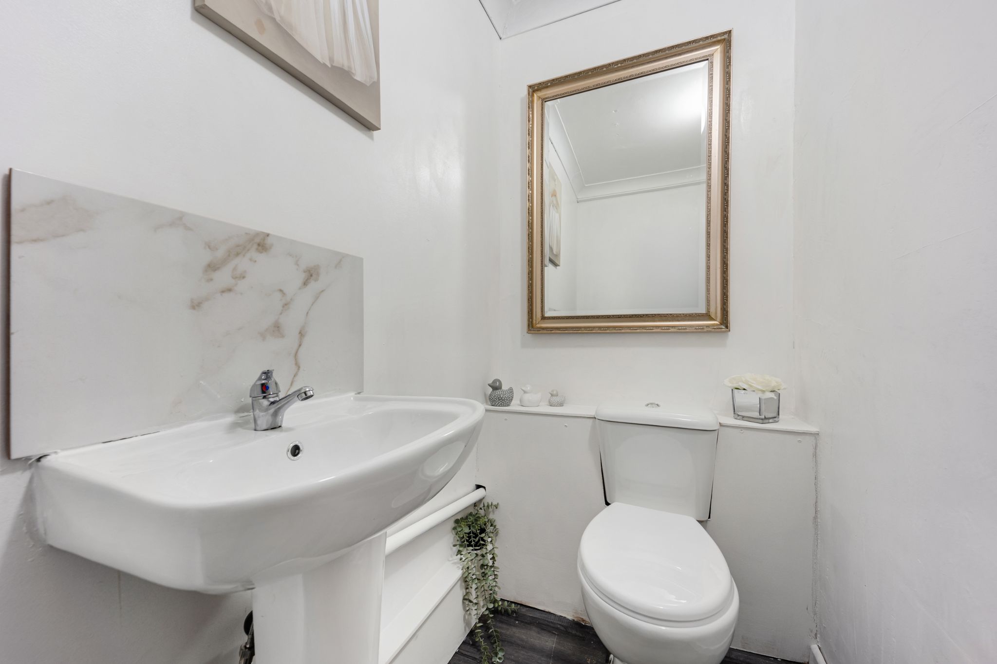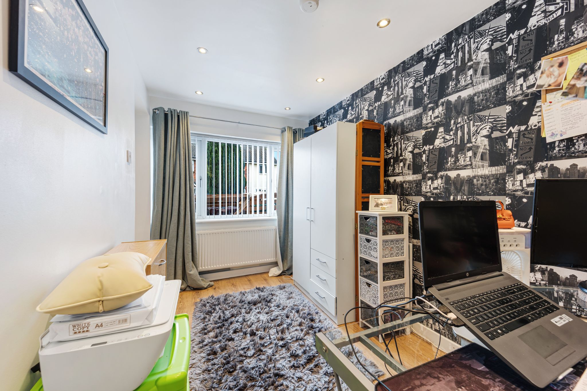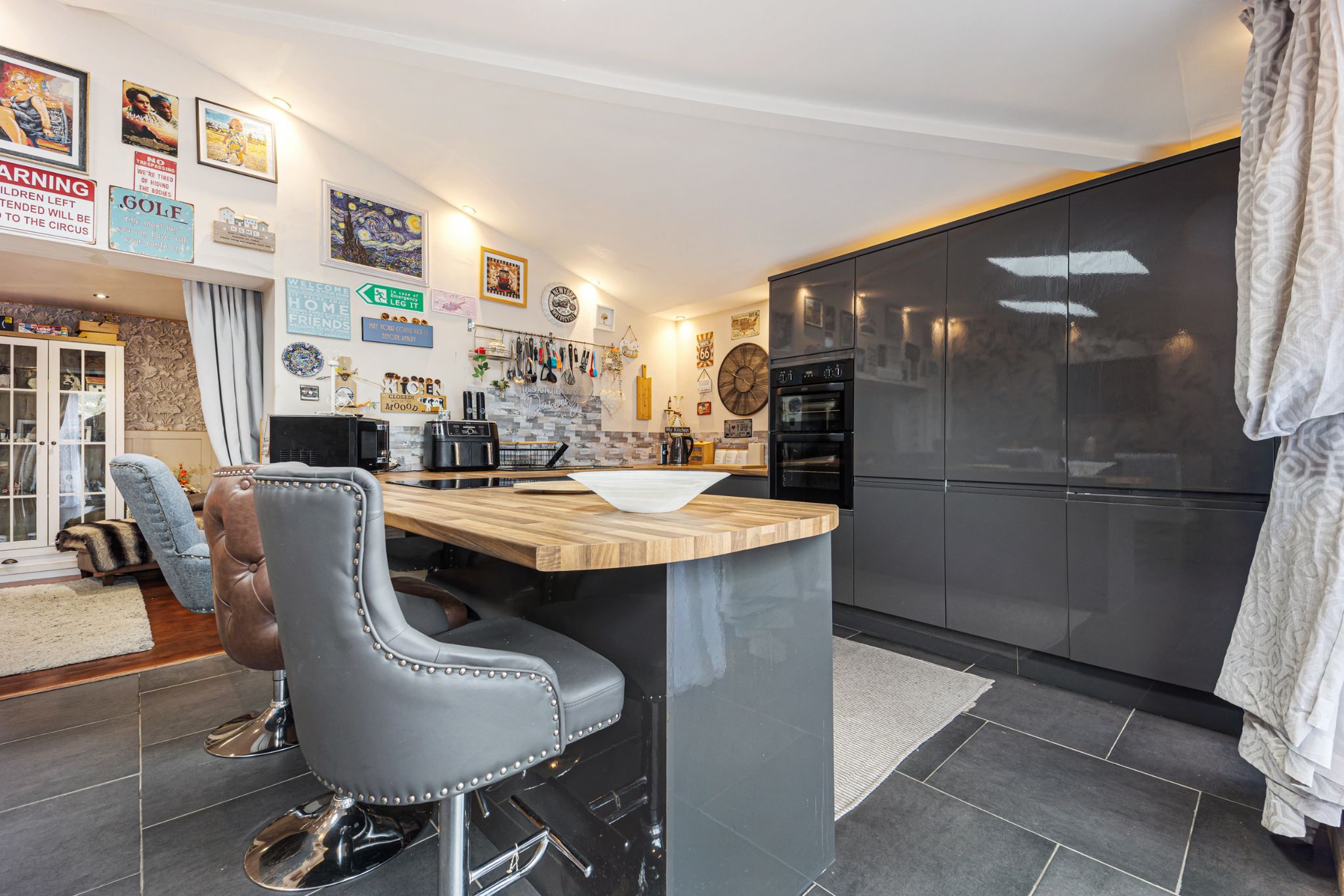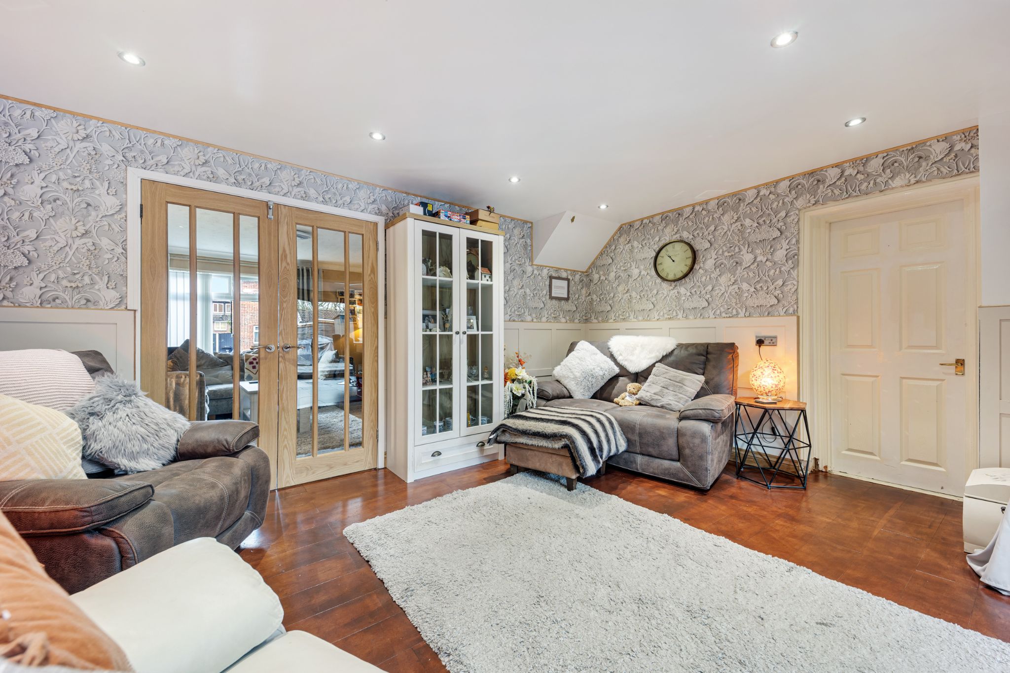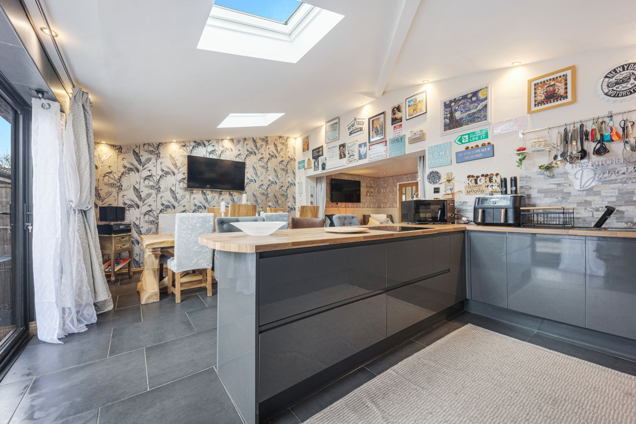 Into the entrance vestibule leading through to the hallway. To your left is the second reception room, currently used as a home office, offering a versatile space that could easily be adapted to suit a variety of needs including a fourth bedroom. Returning to the hallway, double doors open into the spacious lounge, featuring a large window overlooking the front of the property and benefitting from a convenient understairs storage cupboard. A second set of double doors take you into the impressive extended open-plan kitchen and dining area, which also provides a further comfortable sitting space. There is ample room for a dining table, alongside a breakfast bar – perfect for enjoying your morning coffee. Bi-folding doors open out to the rear garden, seamlessly bringing the outdoors in during the warmer months, while two Velux windows flood the space with natural light. The kitchen is fitted with stylish grey gloss wall and base units and includes integrated appliances such as an electric hob, oven and grill, dishwasher, a full-length fridge, and a stainless steel sink. This fantastic open space is ideal for entertaining and hosting family and friends. The utility room provides space for a washing machine, tumble dryer and freezer, and also houses the boiler. Just off the utility room is a convenient downstairs WC, perfect for guests.
