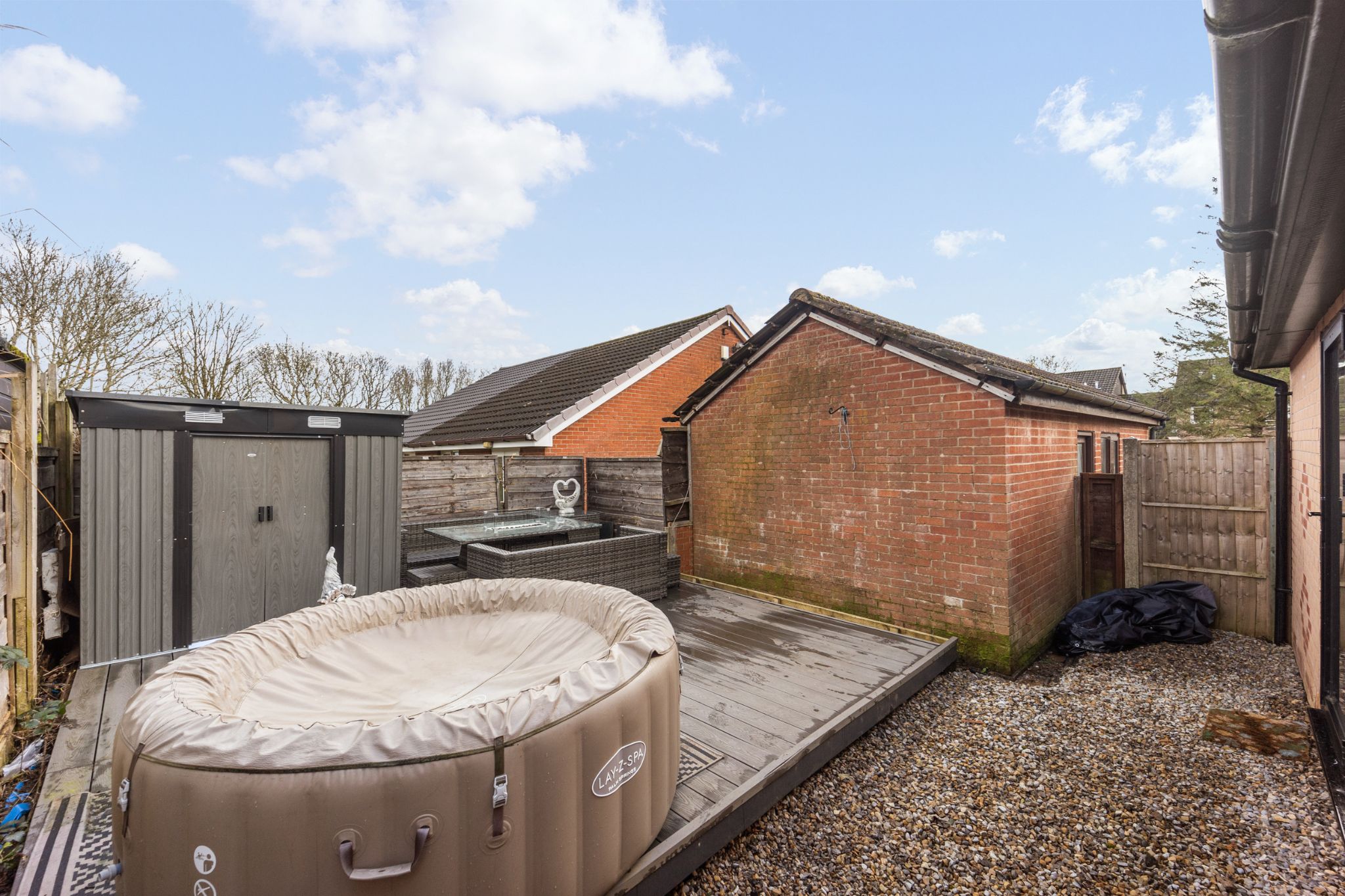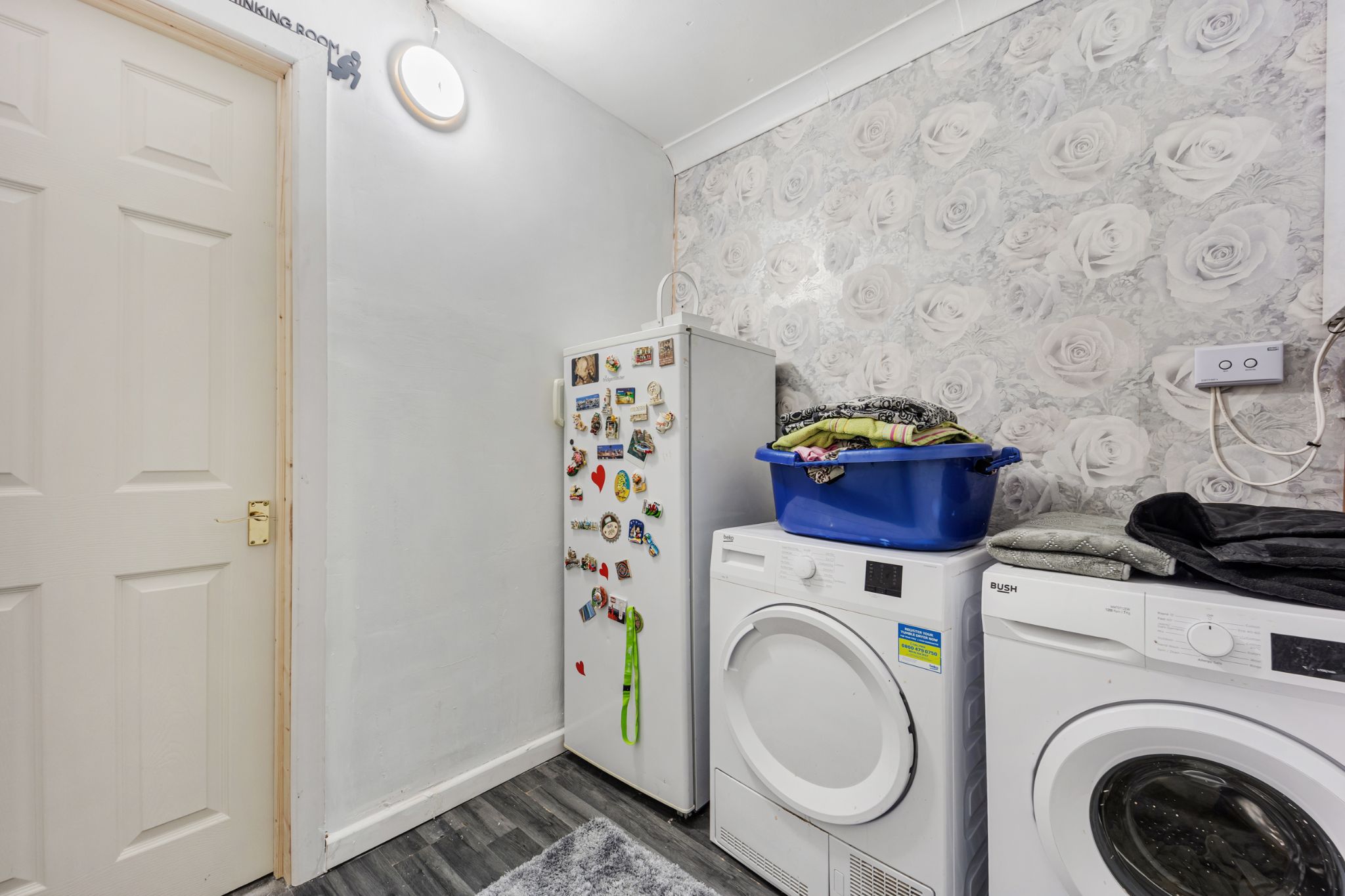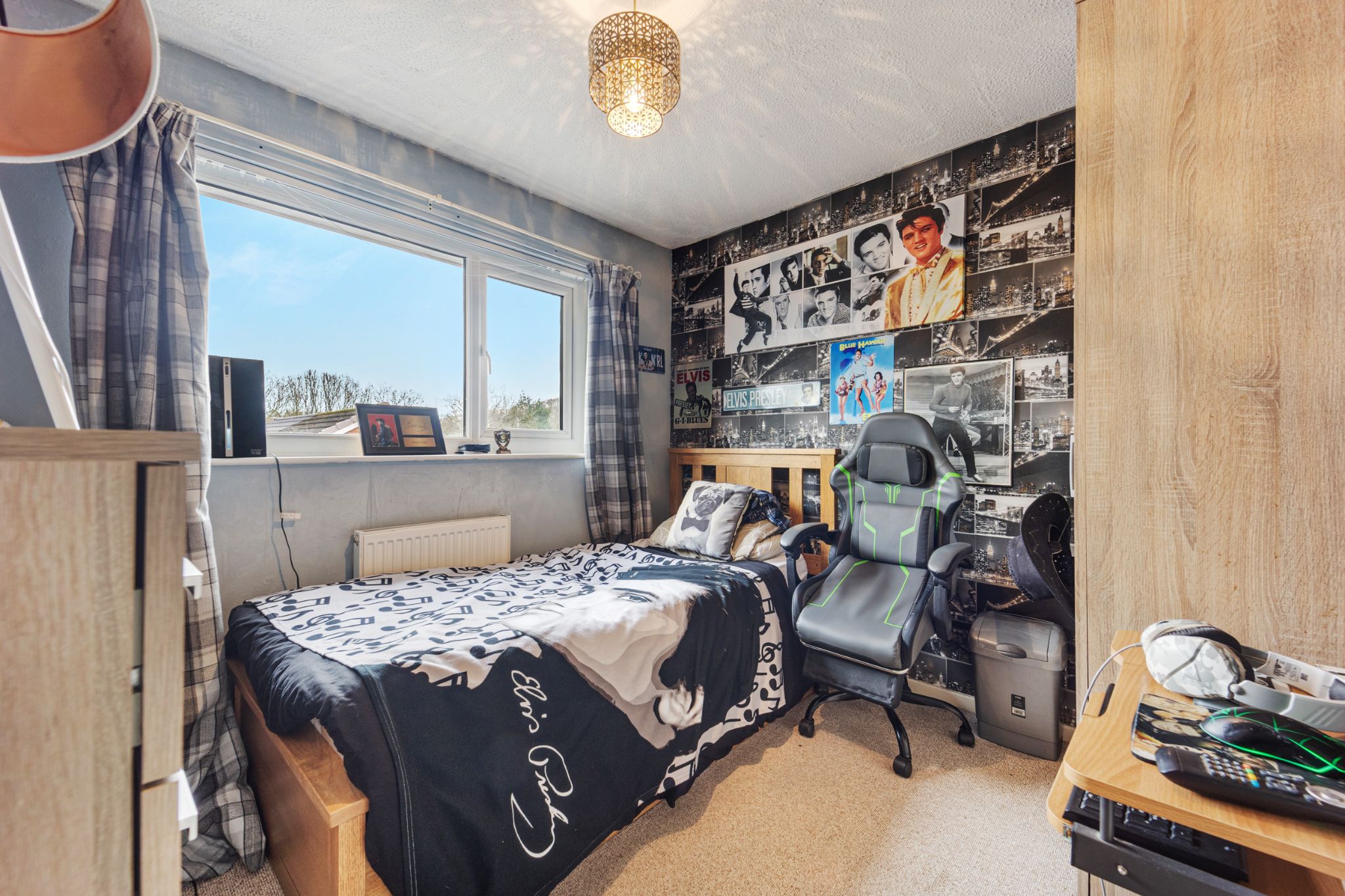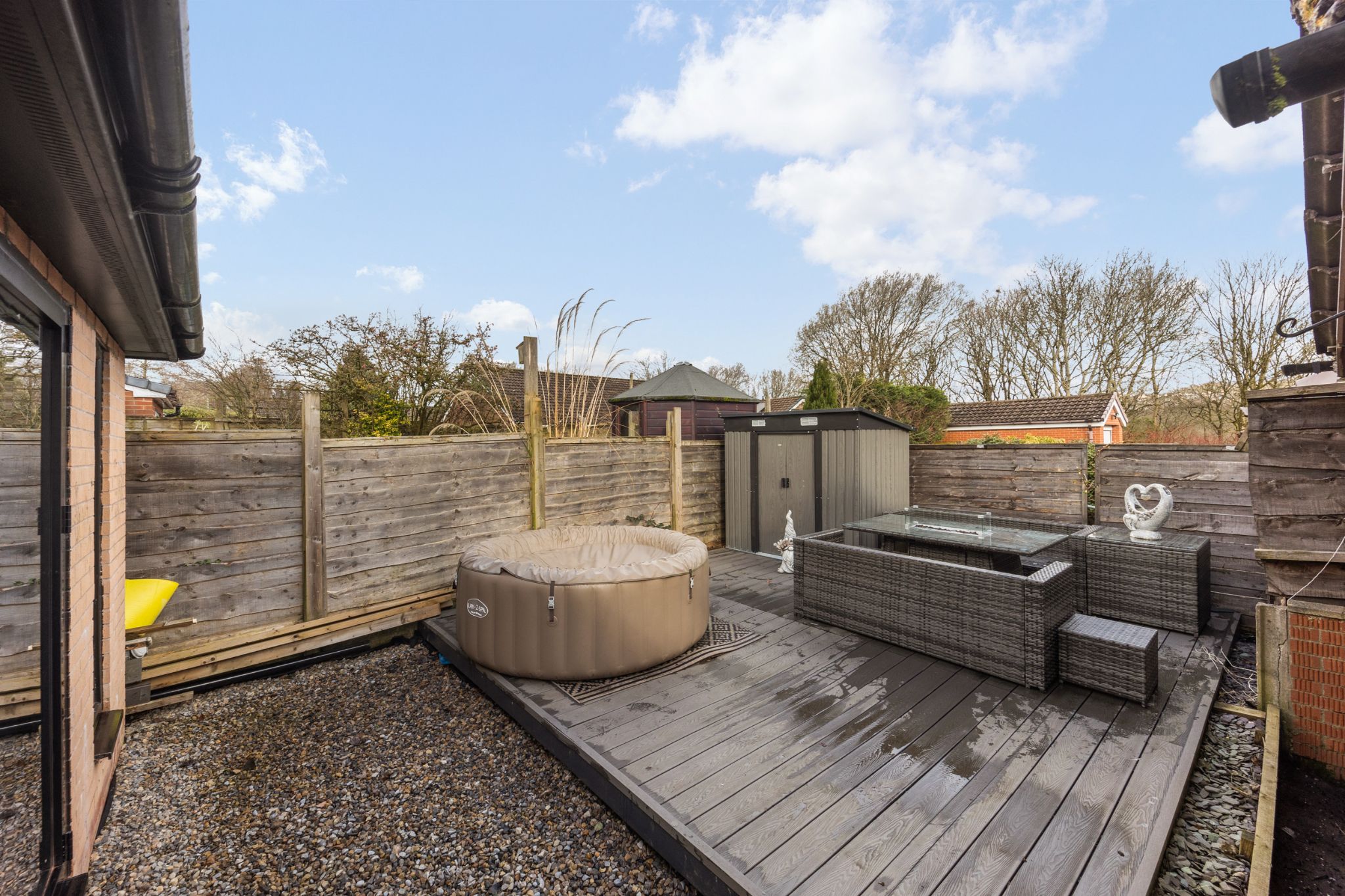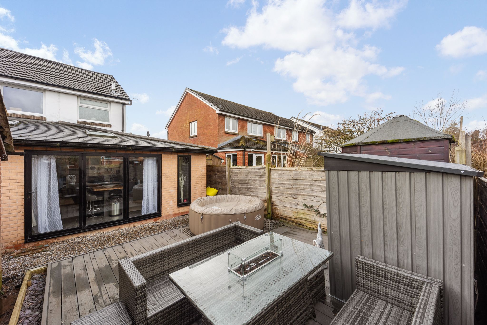 To the rear there is a low-maintenance garden featuring a decked and stoned patio area, ideal for outdoor furniture and enjoying the warmer summer months. The garden also benefits from a useful shed for additional outdoor storage. To the front of the home, there is an Astro-turfed lawn, a driveway providing convenient parking, and a handy bin store.